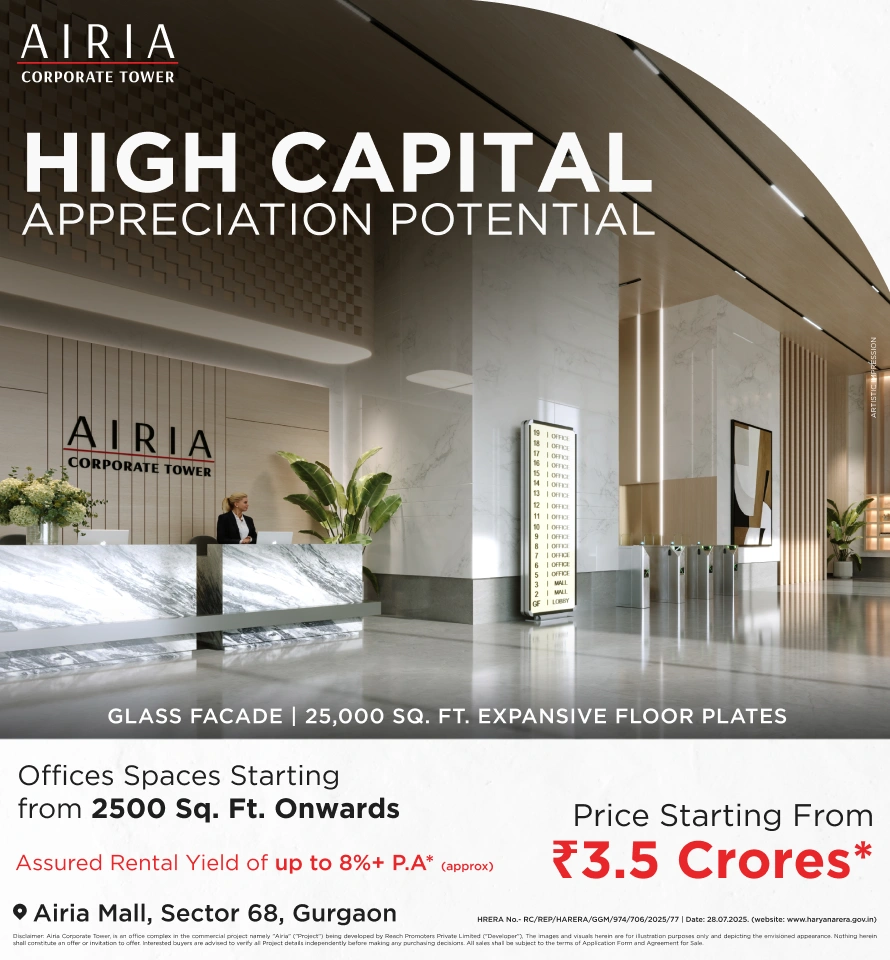 Disclaimer: Airia Corporate Tower, is an office complex in the commercial project namely “Airia” ("Project") being developed by Reach Promoters Private Limited ("Developer"), having HARERA registration No. RC/REP/HARERA/GGM/974/706/2025/77 dated 28-07-2025 available on www.haryanarera.gov.in. The images, visuals, contents, plans and layouts herein are for illustration purposes only, not to scale and are only depicting the envisioned appearance. The approach time may vary subject to weather, traffic or other external factors. The referencing of any operators or brands, if any, is only hypothetical and for reference purposes only. The Developer reserves the right to make changes without prior notice as per applicable laws. The approvals can be checked at the RERA website and/or at the office of the Developer. Interested buyers are advised to verify all Project details independently before making any purchasing decisions. Nothing herein shall constitute an offer or invitation to offer. All sales shall be subject to the terms of Application Form and Agreement for Sale. Unit Conversions: 1 sq. ft. = 0.0929 sq. mtr.; 1 km = 1000 mtr.; 1 min = 60 seconds.